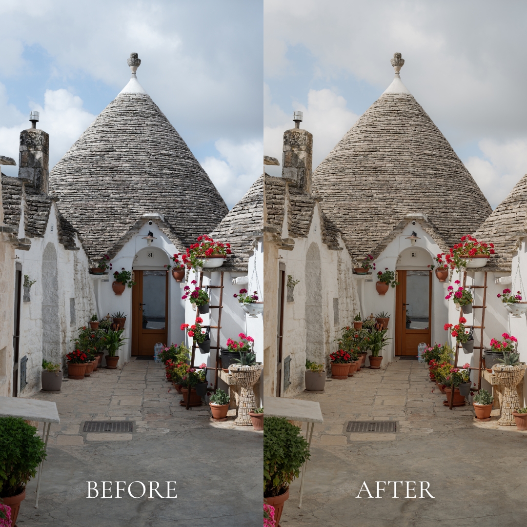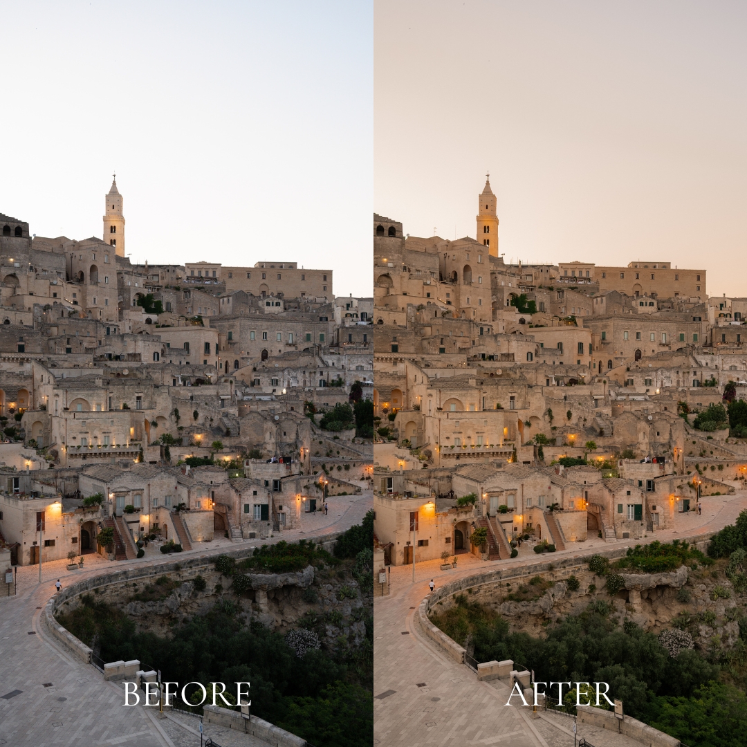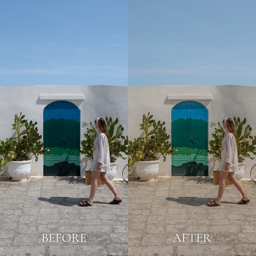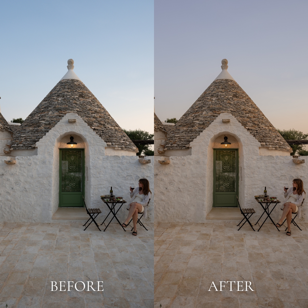 These presets were developed from real Nikon and iPhone images and videos taken in Puglia – from sun-soaked villages and olive groves to coastal towns and golden hour skies. Expect sun-washed tones, soft contrasts, and an inviting warmth that brings out the best in summer photography and video.